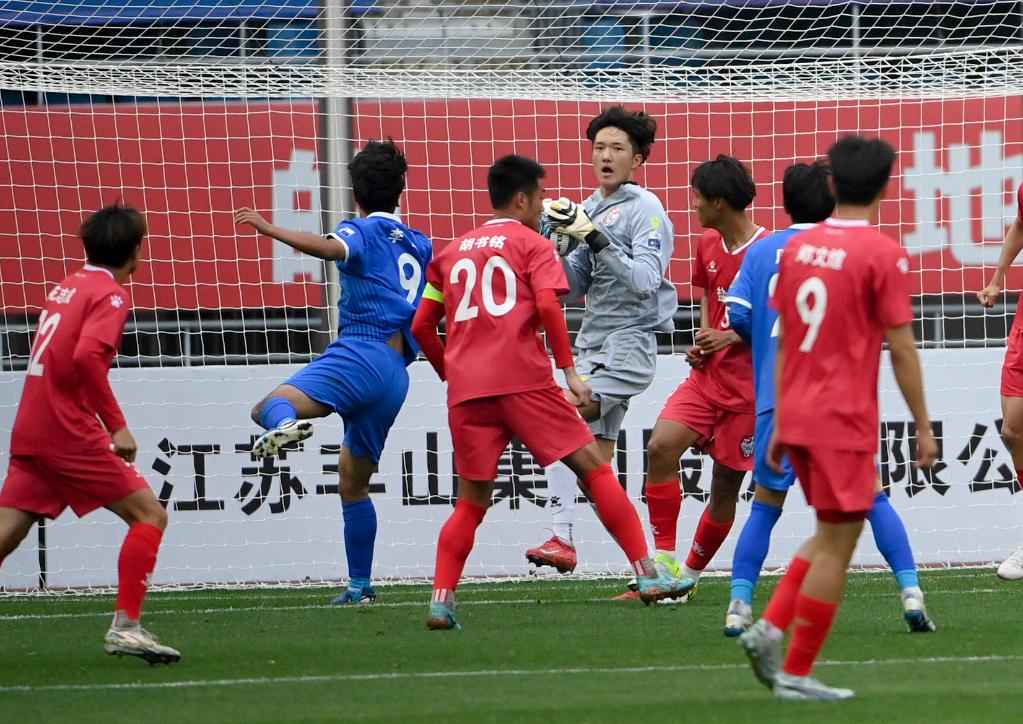 ↑6月1日,鹽城隊守門員李智良(中)在“蘇超”比賽中防守。新華社發(周晨陽 攝)