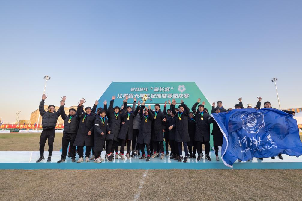 ↑2024年12月8日,2024“省長杯”江蘇省大學生足球聯賽總決賽(高水平男子組)冠軍河海大學隊在頒獎儀式上慶祝。新華社發(胡瀟攝)