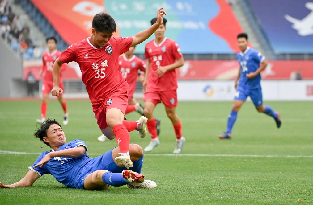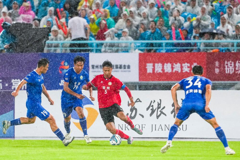 ↑6月1日,鹽城隊球員盛家豪(前上)在“蘇超”比賽中拼搶。新華社發(周晨陽 攝)