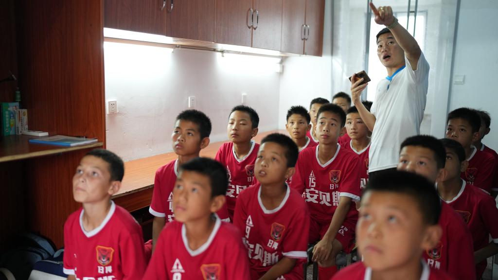 ↑6月7日,小球員在宿舍與教練一同回看比賽錄像。新華社記者 陶亮 攝