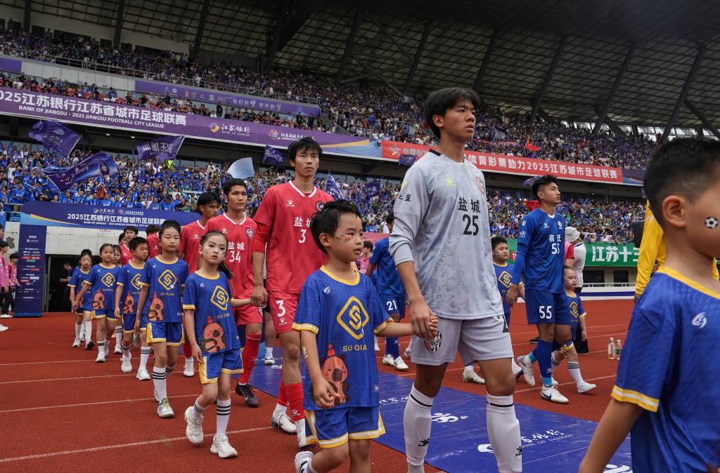 ↑6月21日,嚴子航(前右一)在“蘇超”第四輪鹽城隊對陣宿遷隊的比賽前入場。新華社發(周晨陽 攝)