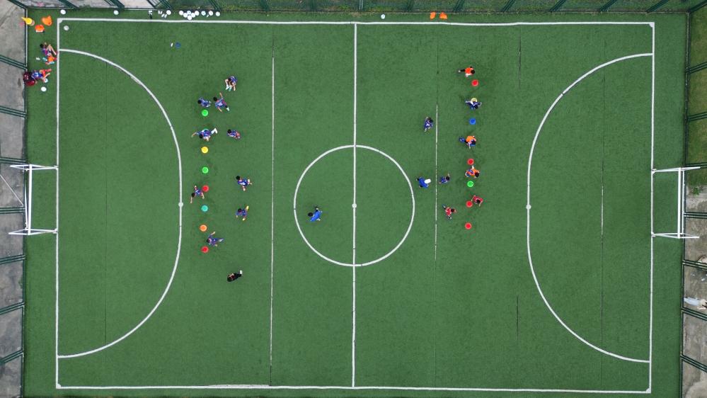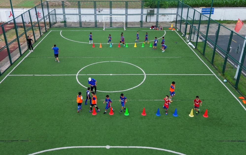 ↑6月7日,小球員在基地進行訓練(無人機照片)。新華社記者 徐速繪 攝
