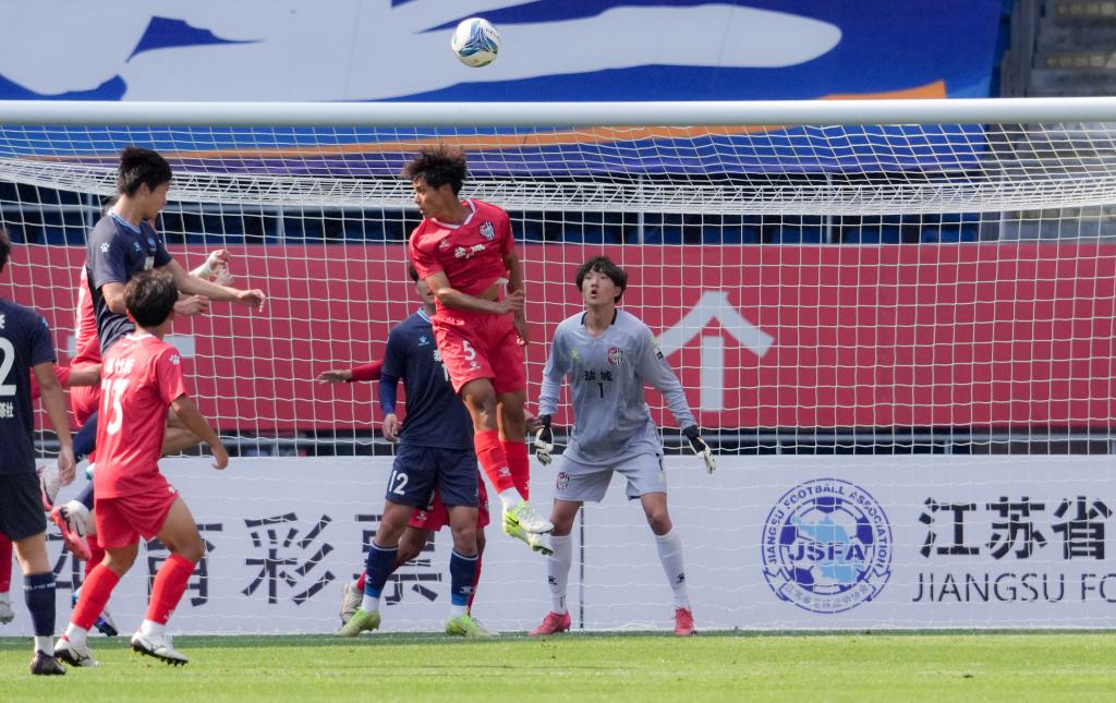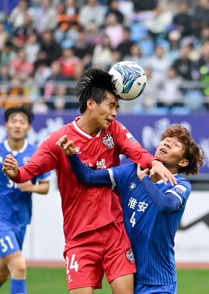 ↑5月24日,鹽城隊球員王俊飛(右二)在“蘇超”比賽中頭球解圍。新華社發(周晨陽 攝)