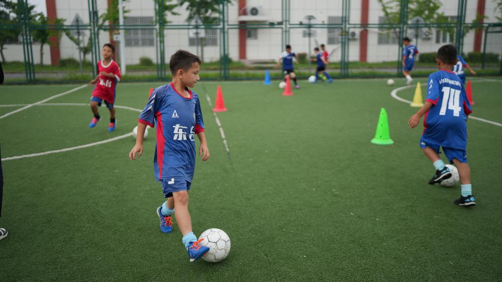 ↑6月7日,來自新疆的小球員蘇代伊斯(前)在安貝斯足球俱樂部訓練。新華社記者 陶亮 攝