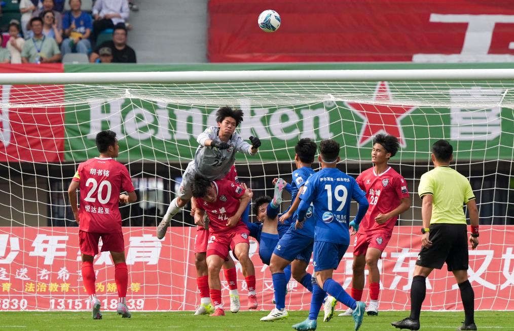 ↑6月21日,嚴子航(左二)在“蘇超”第四輪鹽城隊對陣宿遷隊的比賽中撲救。新華社發(周晨陽 攝)