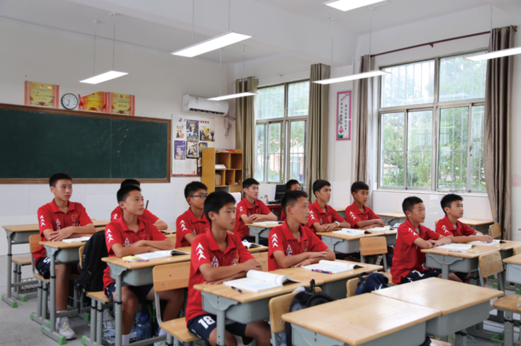 ↑2024年5月,球員在東臺沿海實驗中學教室內學習初二課程。(新華社發/安貝斯足球俱樂部供圖)