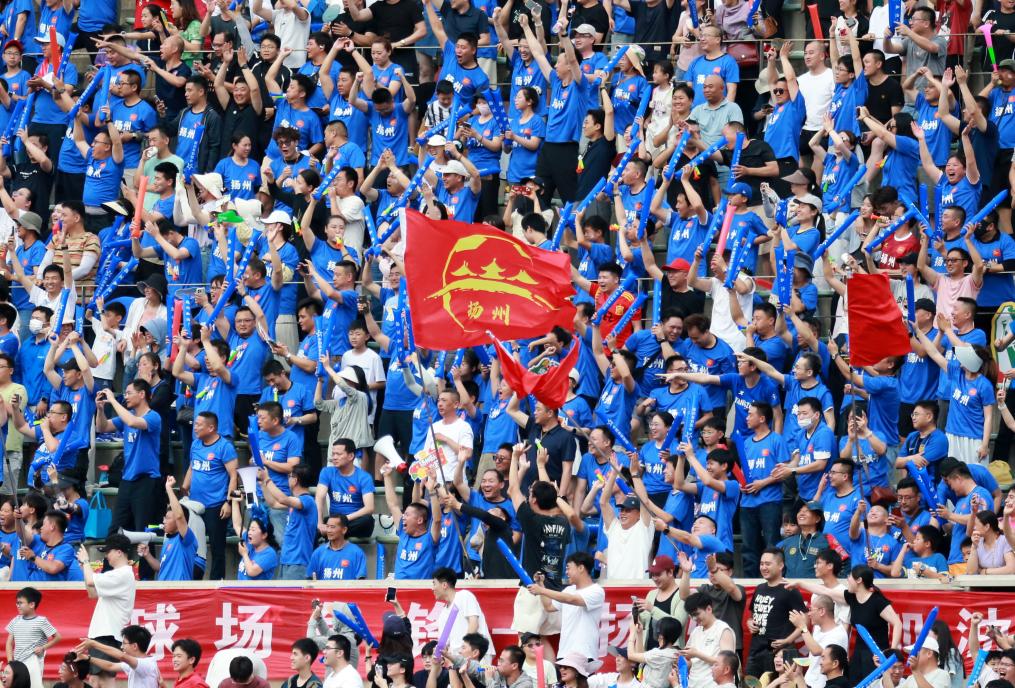 ↑6月14日,揚州隊球迷在“蘇超”第四輪比賽中為球隊加油助威。新華社發(孟德龍攝)