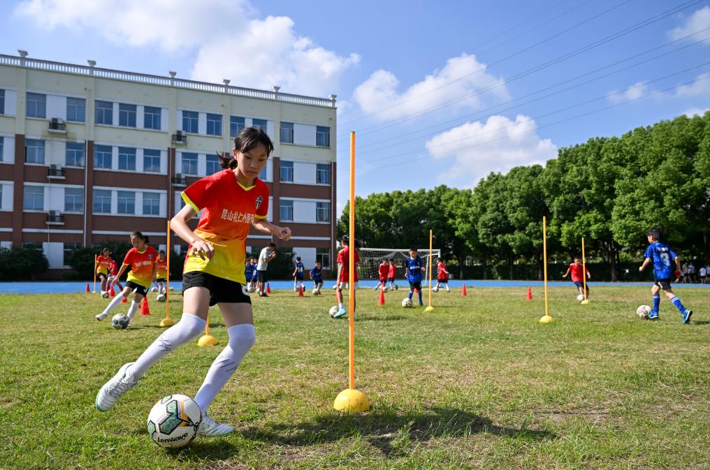 ↑2024年9月14日,江蘇昆山禮仁外國語學校的學生在大課間進行足球基本功訓練。新華社發(王須中攝)