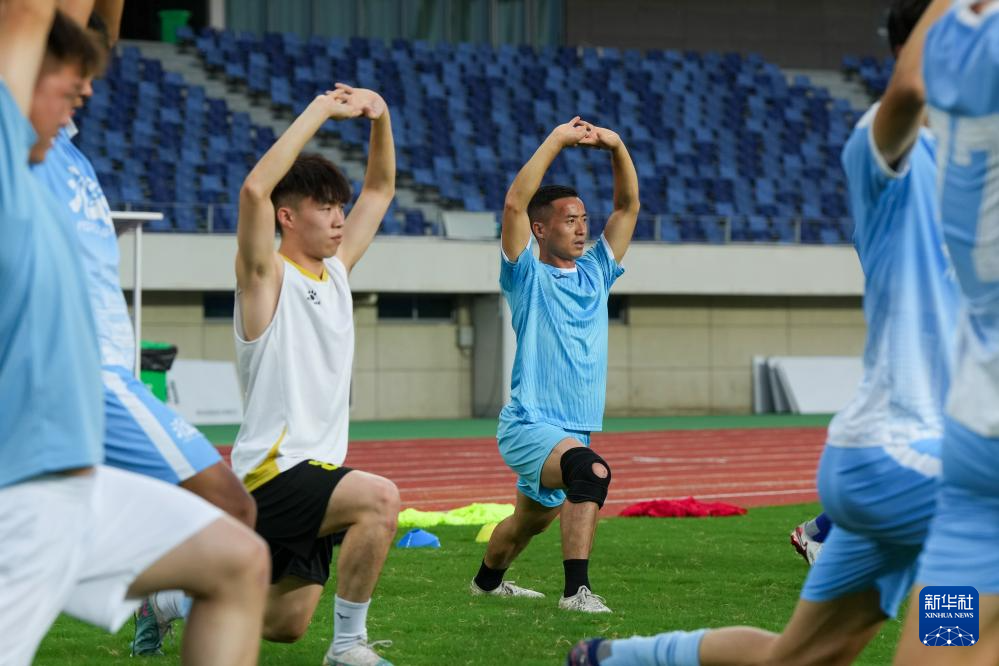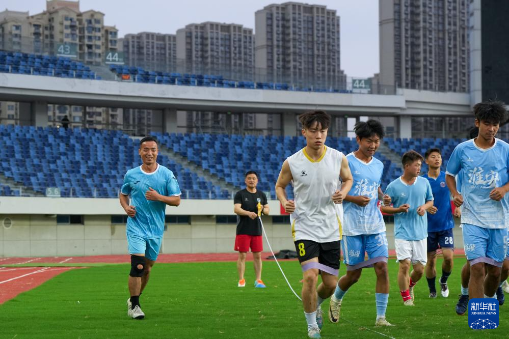 6月23日,戴虎(左一)在淮安奧體中心體育場和隊友們進行日常訓練。新華社記者 李博 攝