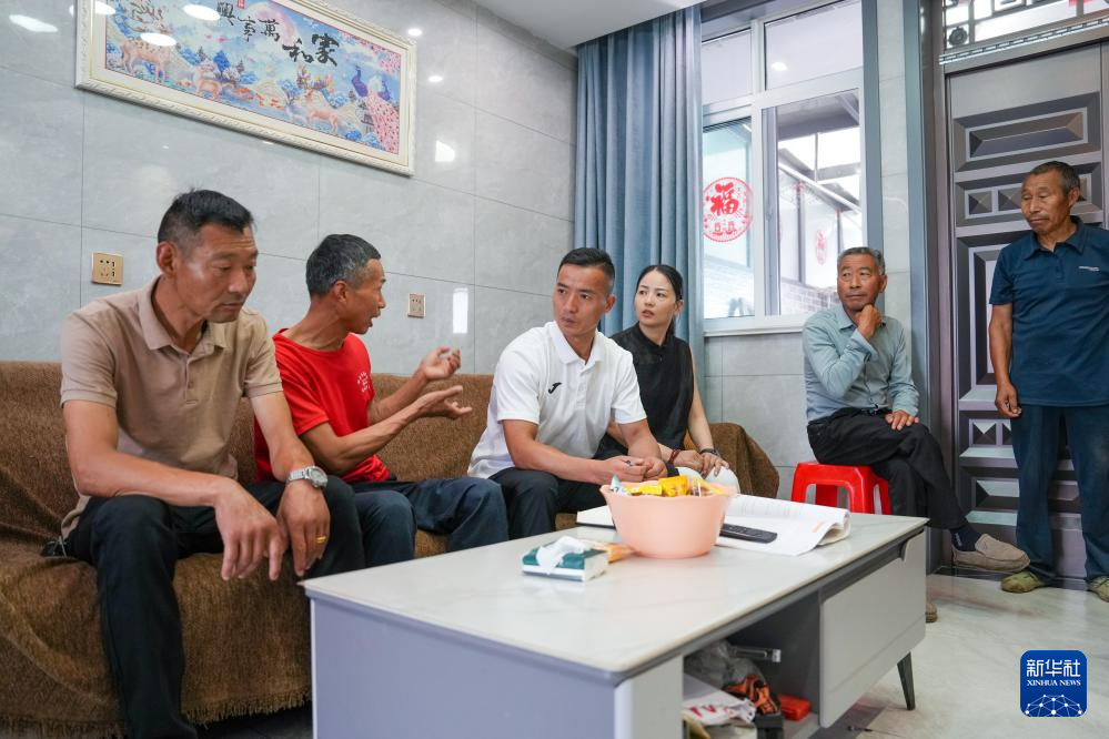 6月23日,戴虎(左三)和同事在韓陳村村民皇星中(左二)家中走訪。新華社記者 李博 攝