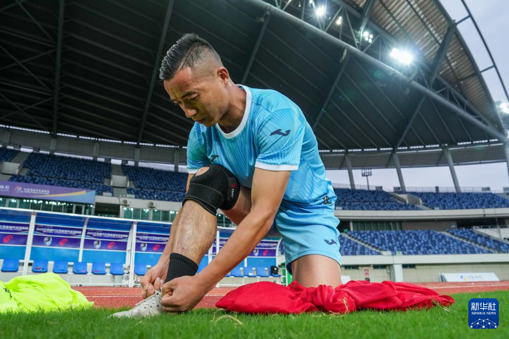 6月23日,戴虎在淮安奧體中心體育場內穿球鞋,準備和隊友們一起參加訓練。新華社記者 李博 攝
