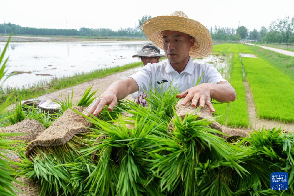 6月23日,戴虎(前)幫助村民搬運水稻秧苗。新華社記者 李博 攝