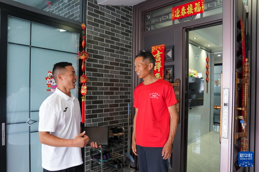 6月23日,戴虎(左)來到韓陳村村民皇星中家走訪。新華社記者 李博 攝