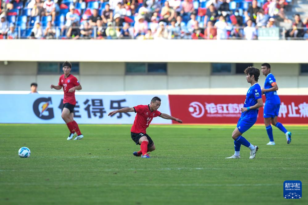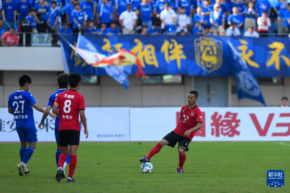 6月14日,淮安隊球員戴虎(左二)在2025江蘇省城市足球聯賽第四輪對陣南京隊的比賽中。最終,淮安隊主場與南京隊1比1戰平。
