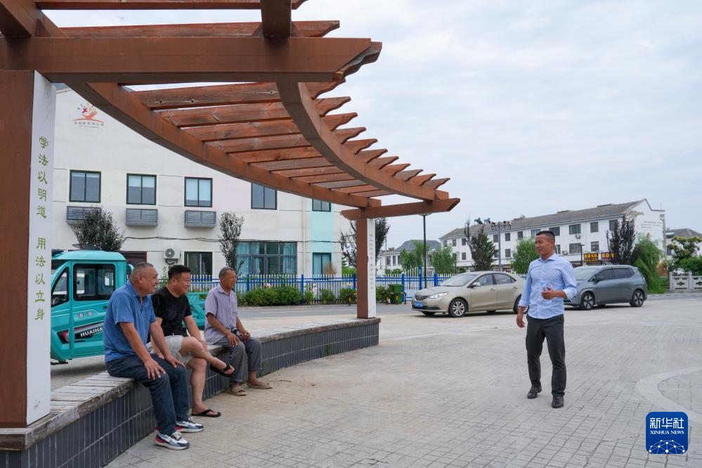 6月23日,戴虎(右一)與韓陳村與村民們討論“蘇超”賽況。新華社記者 李博 攝