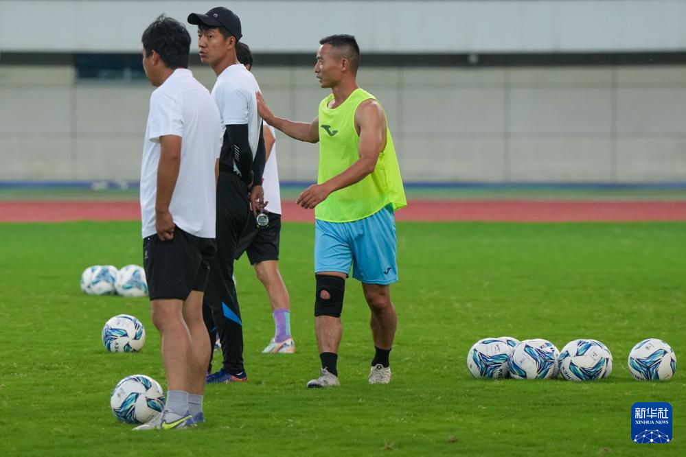 6月23日,戴虎(右)在訓練中與淮安隊主教練董松(左二)交流。新華社記者 李博 攝