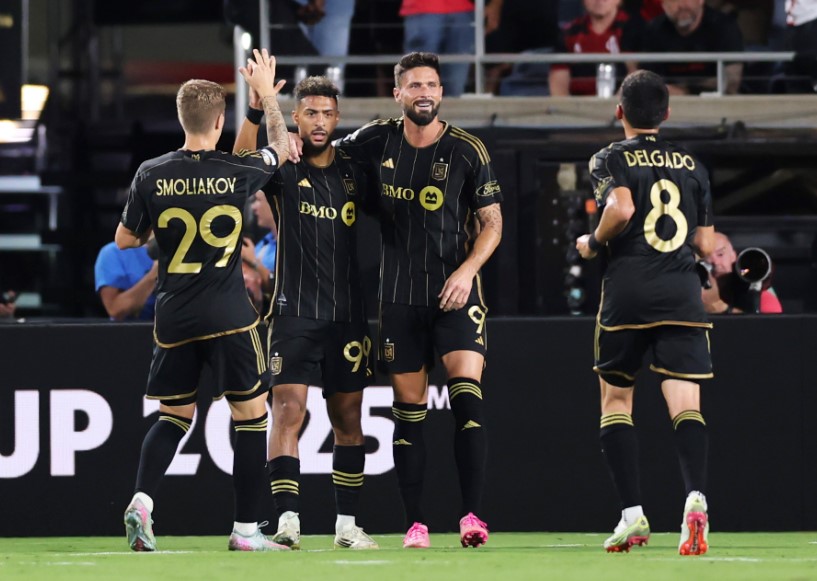 洛杉磯FC隊球員布安加(左二)與隊友慶祝進球。圖片來自國際足聯官方圖集