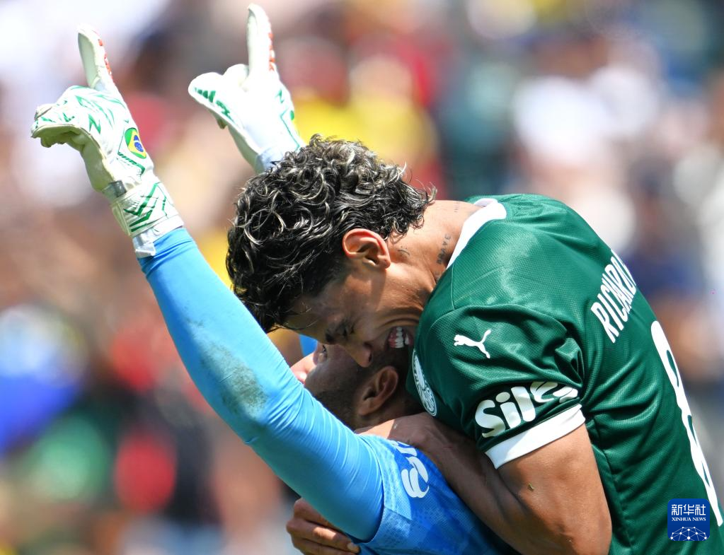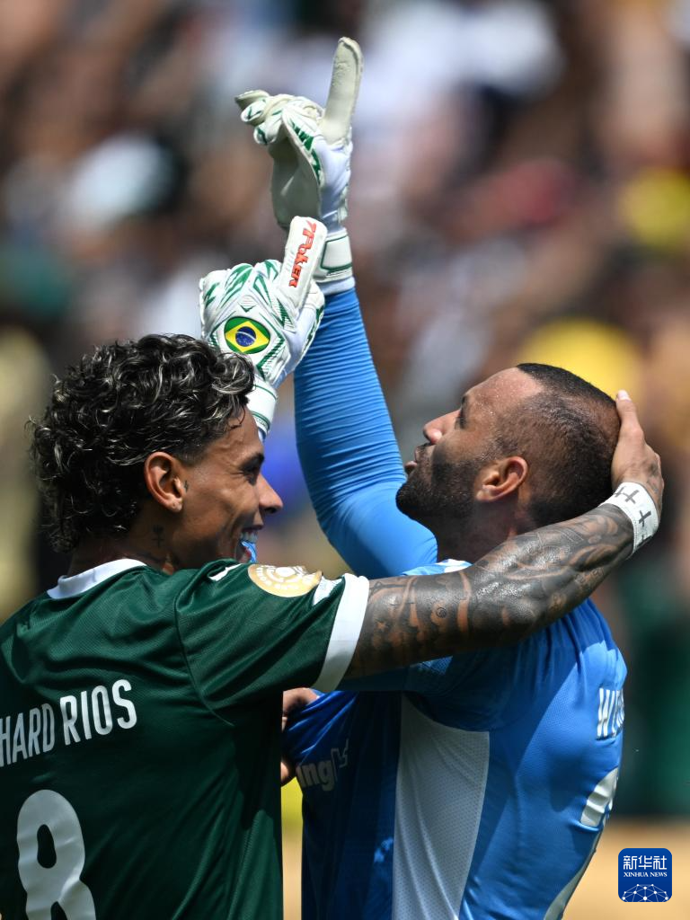 6月28日,帕爾梅拉斯隊守門員韋弗頓(右)和隊友里奧斯賽后慶祝球隊勝利。