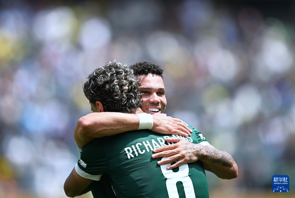 6月28日,帕爾梅拉斯隊球員保利尼奧(右)破門得分后與隊友里奧斯慶祝。
