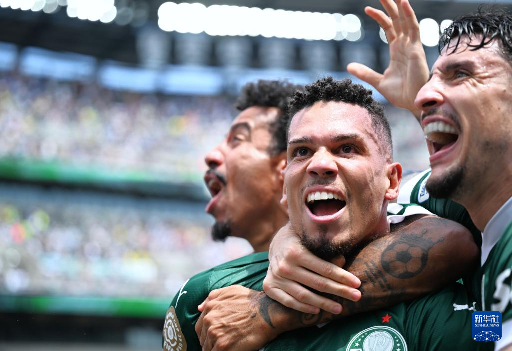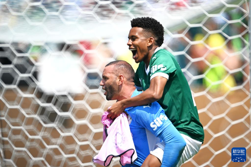 6月28日,帕爾梅拉斯隊球員保利尼奧(左)在比賽中與隊友慶祝得分。