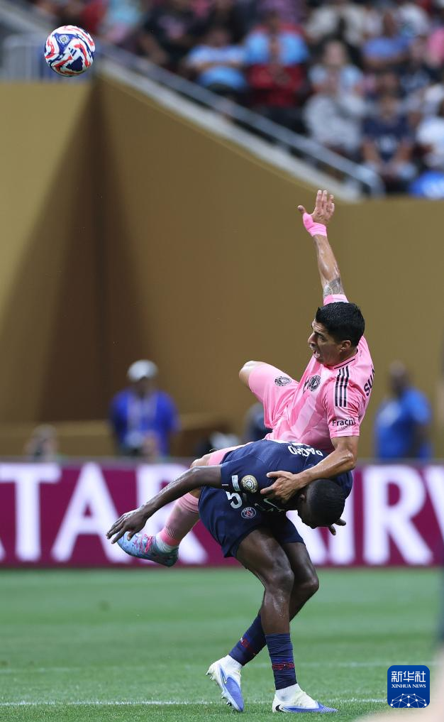 6月29日,邁阿密國際隊球員蘇亞雷斯(上)與巴黎圣日耳曼隊球員帕喬在比賽中拼搶。新華社記者 李明 攝