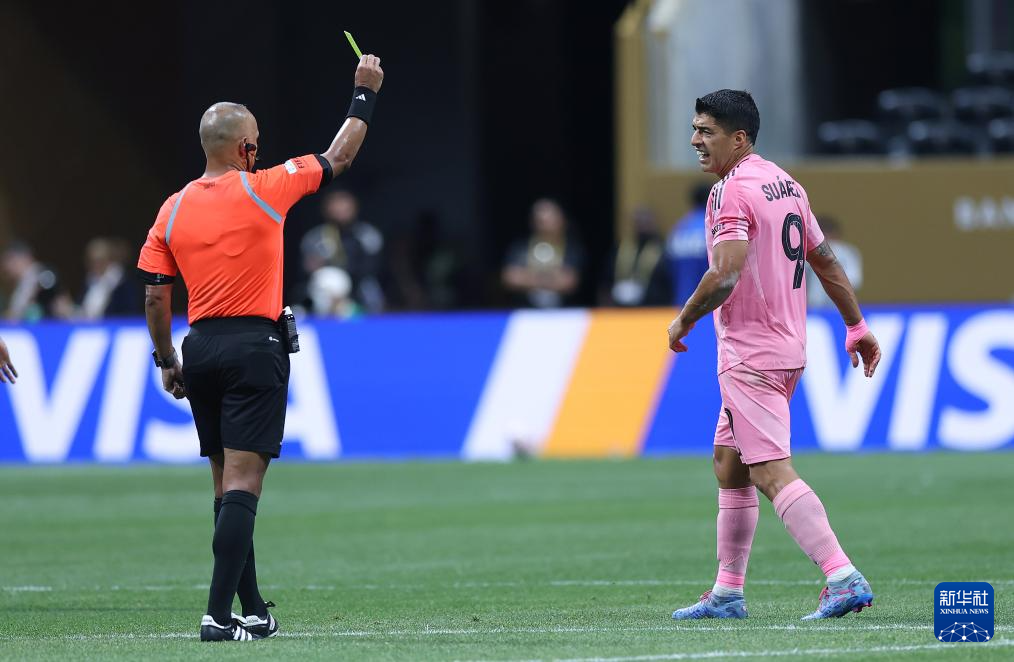 6月29日,邁阿密國際隊球員蘇亞雷斯(右)被主裁判出示黃牌。新華社記者 李明 攝