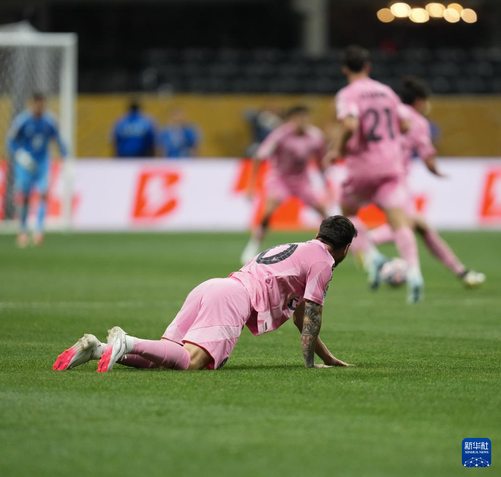 6月29日,邁阿密國際隊球員梅西在比賽中被搶斷后倒地。新華社記者 黃宗治 攝