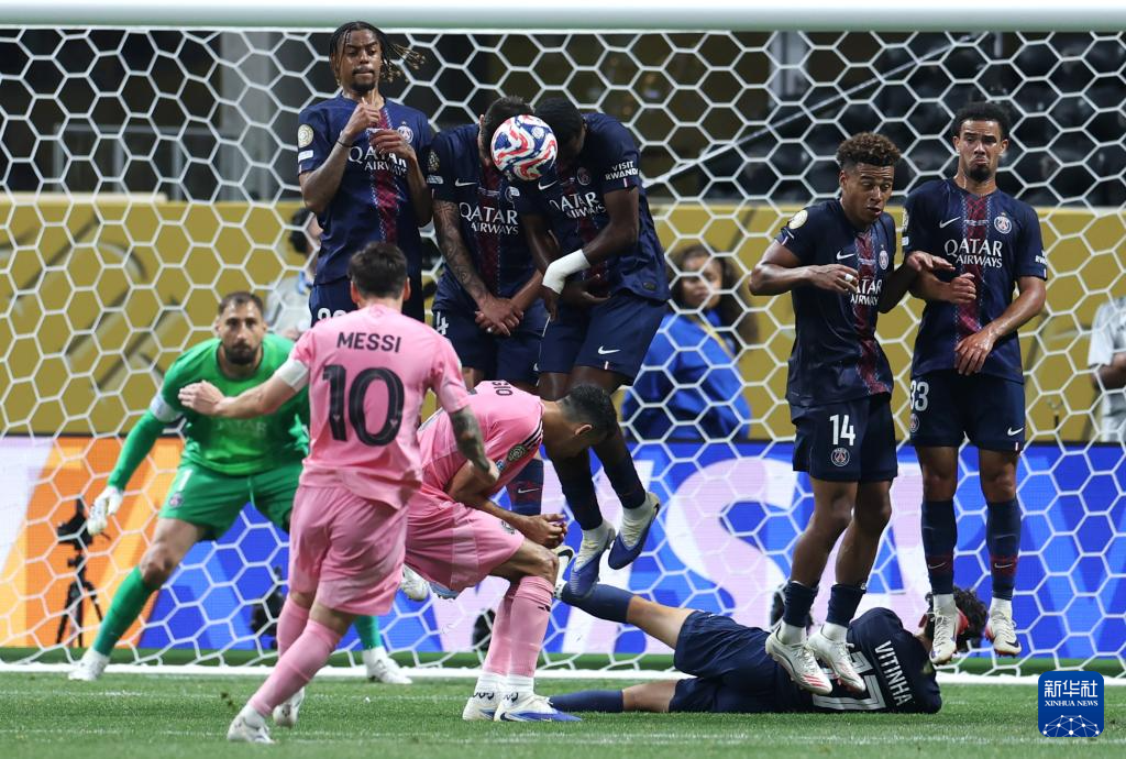 6月29日,巴黎圣日耳曼隊球員在比賽中防守邁阿密國際隊球員梅西主罰的任意球。新華社記者 李明 攝