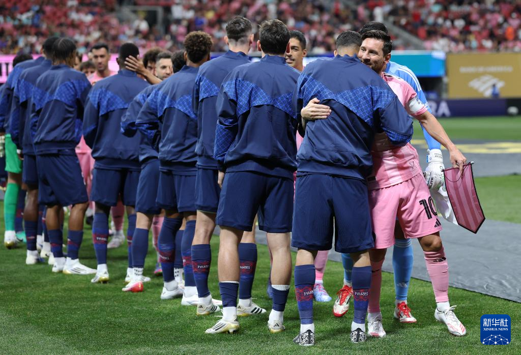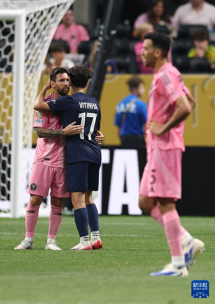 6月29日,邁阿密國際隊球員梅西(左)在比賽后與巴黎圣日耳曼隊球員維蒂尼亞擁抱致意。新華社記者 李明 攝