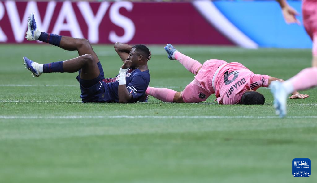 6月29日,邁阿密國際隊球員蘇亞雷斯(右)與巴黎圣日耳曼隊球員帕喬在比賽中拼搶后倒地。新華社記者 李明 攝