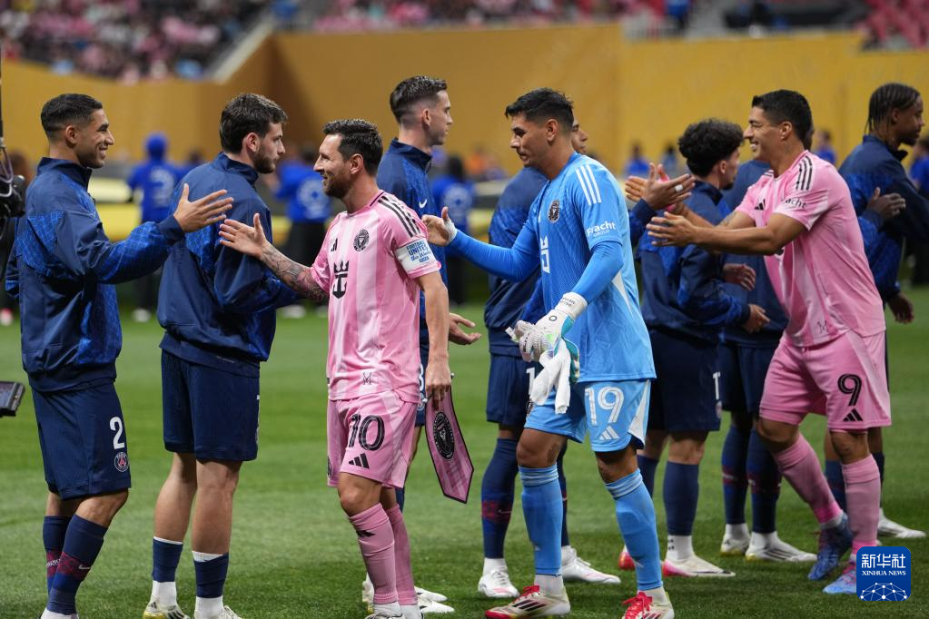 6月29日,邁阿密國際隊球員梅西(右二)在比賽后與巴黎圣日耳曼隊門將多納魯馬擁抱致意。新華社記者 李明 攝