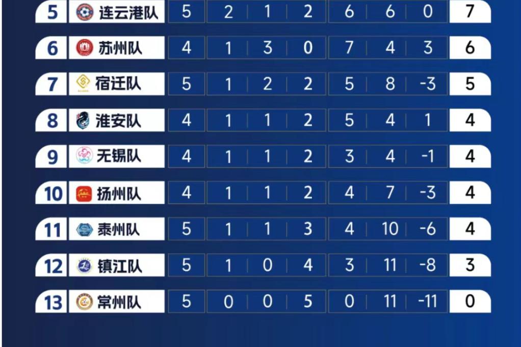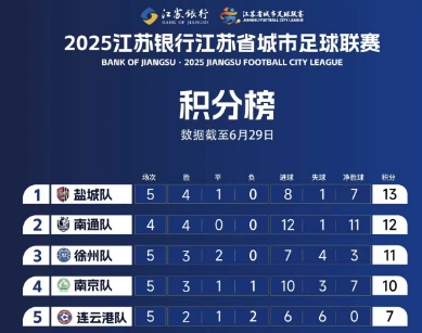 ↑江蘇省城市足球聯賽目前積分榜前五位