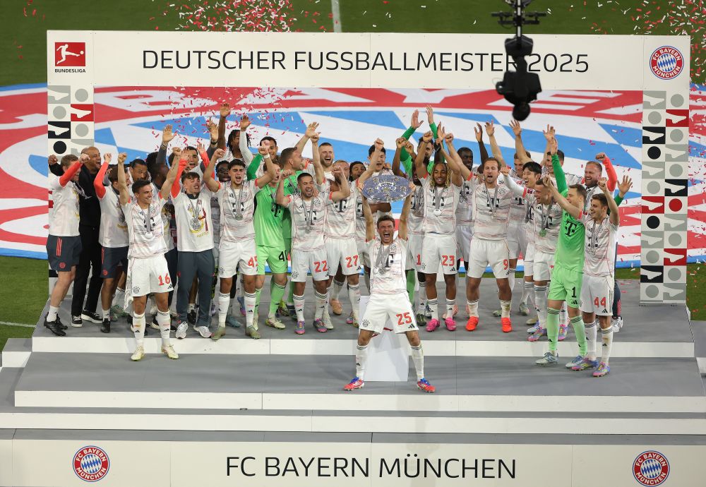 2025年5月10日,穆勒(前中)在頒獎儀式上高舉獎杯與隊友慶祝拜仁慕尼黑隊取得歷史上第33個德甲冠軍。新華社發(菲利普·魯伊茲攝)
