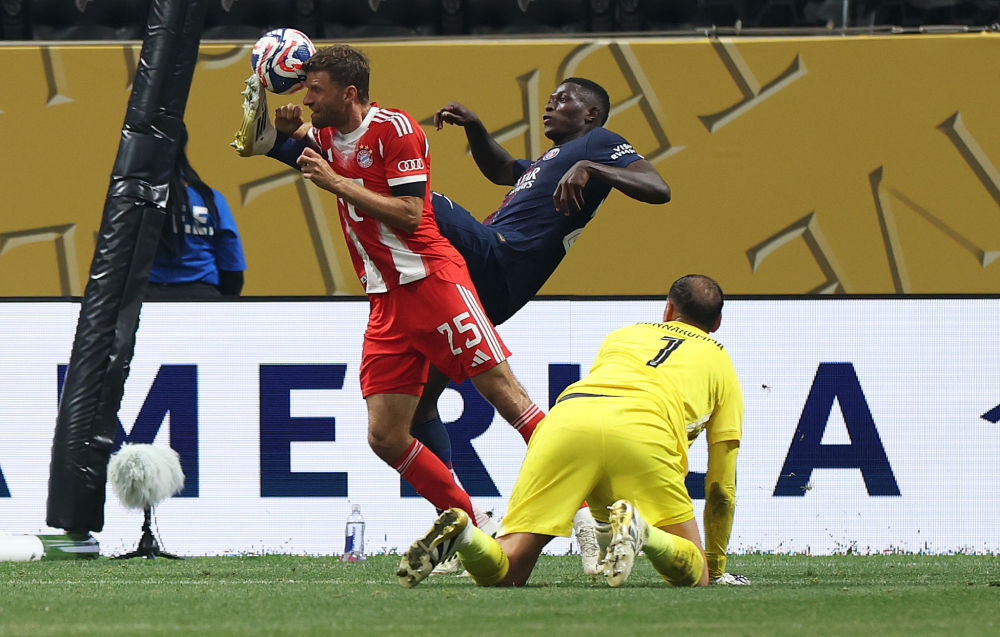 7月5日,穆勒(左)與巴黎圣日耳曼隊的努諾·門德斯(中)在比賽中拼搶,用頭搶先觸球。新華社記者 李明 攝
