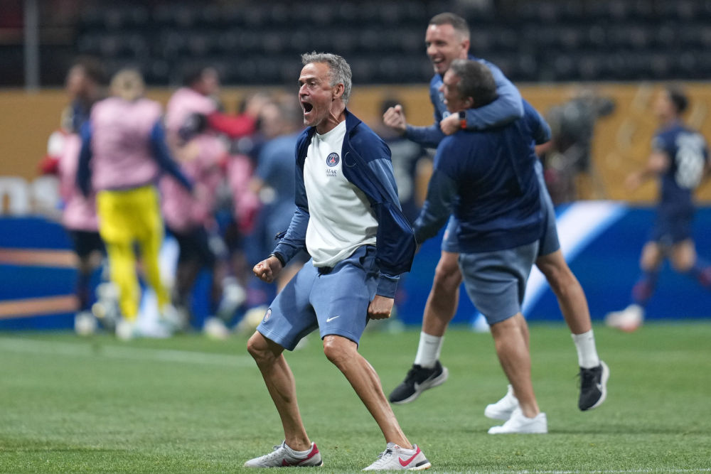 巴黎圣日耳曼主教練恩里克在比賽中慶祝。新華社記者 黃宗治 攝