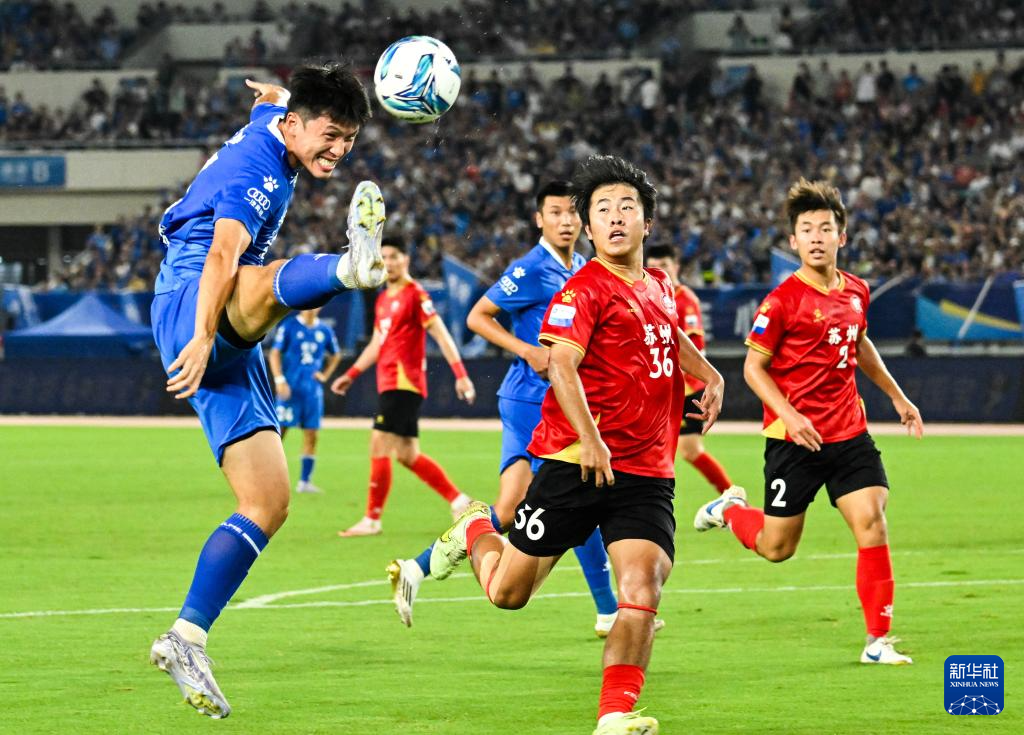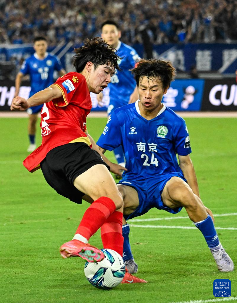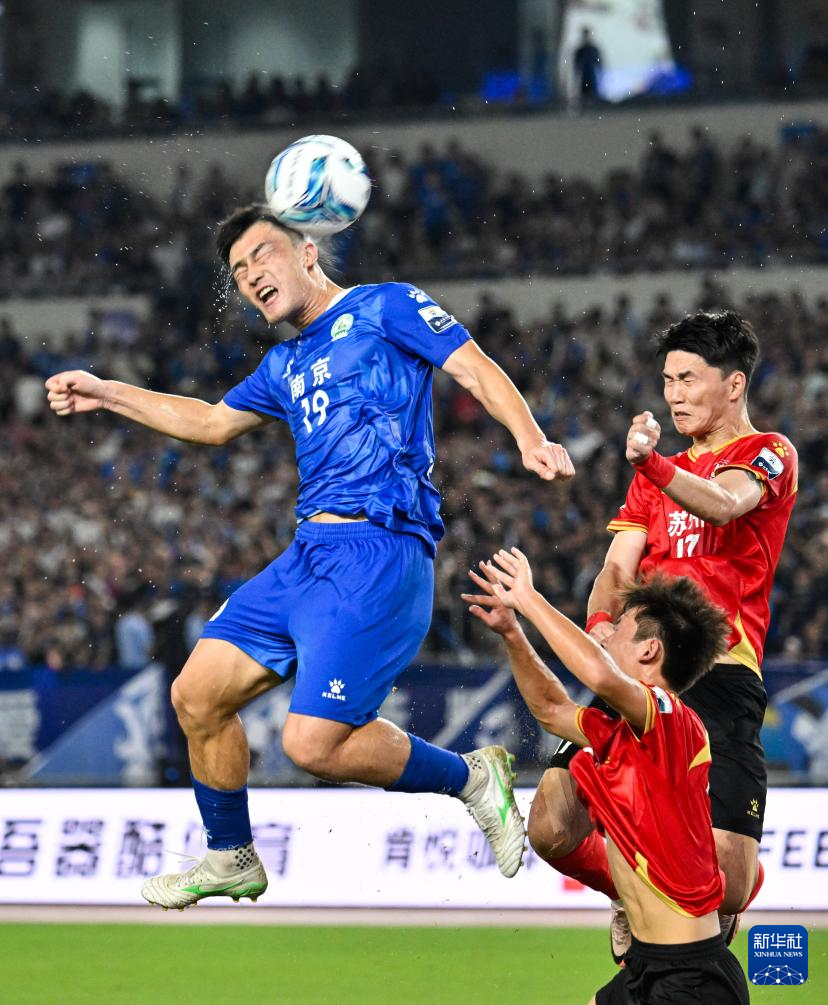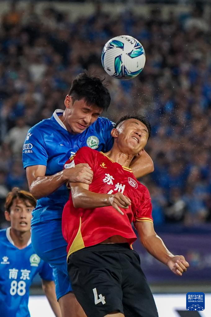 7月5日,蘇州隊球員邢序飛(前)在比賽中與南京隊球員李加俊爭頂。