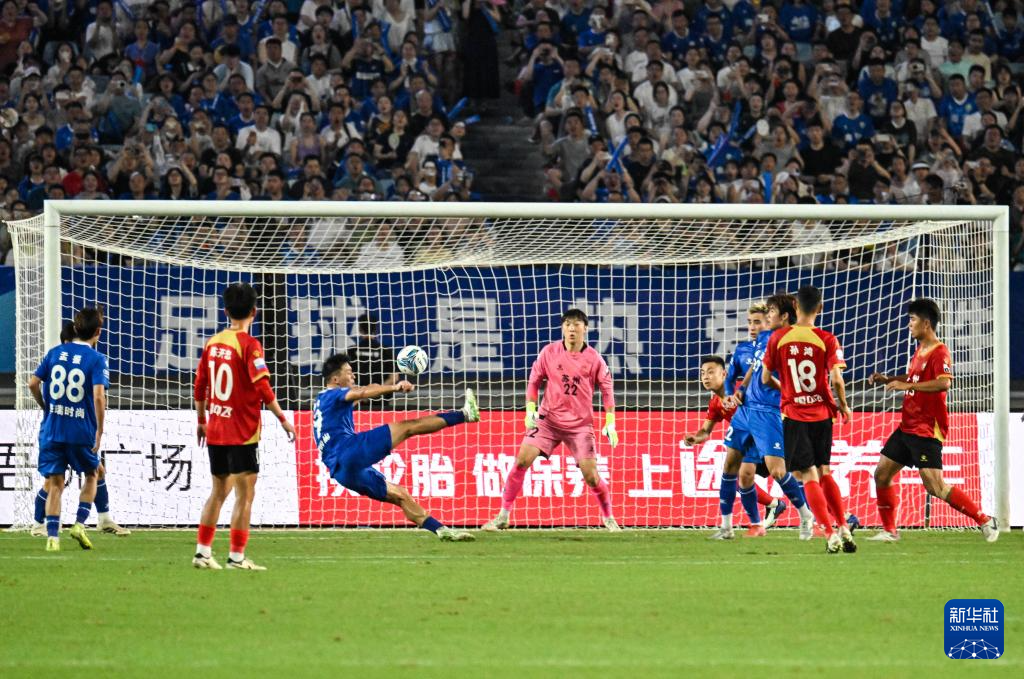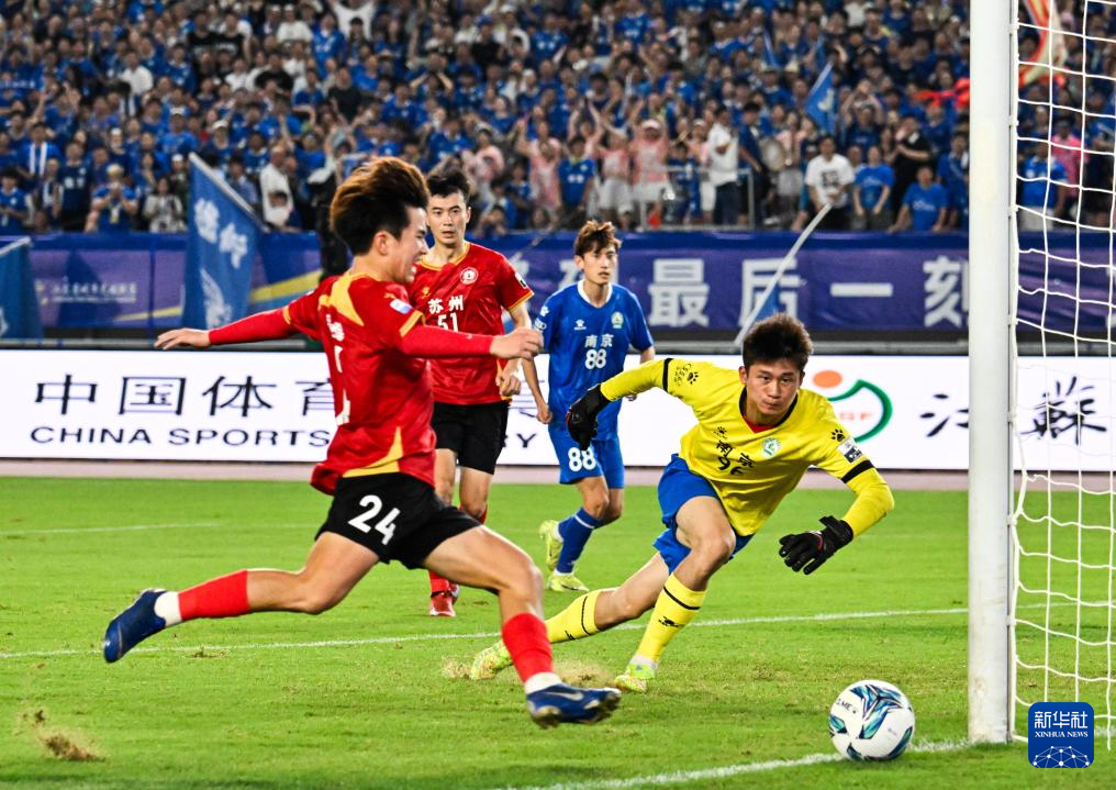 7月5日,南京隊門將鄭豪(右一)在比賽中封堵蘇州隊球員寇程(左一)的射門。