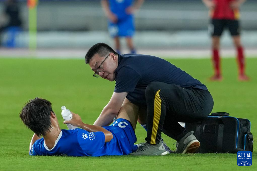 7月5日,南京隊隊醫為球員司俊琰(下)進行治療。