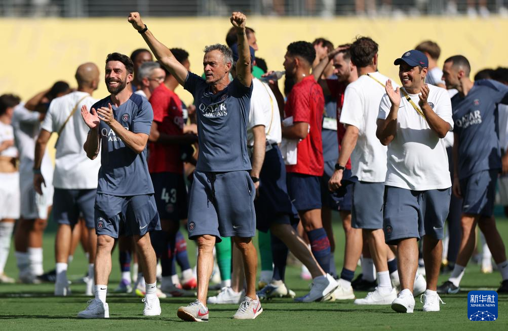 7月9日,巴黎圣日耳曼隊主教練恩里克(前右)在比賽后慶祝。新華社記者 李明 攝