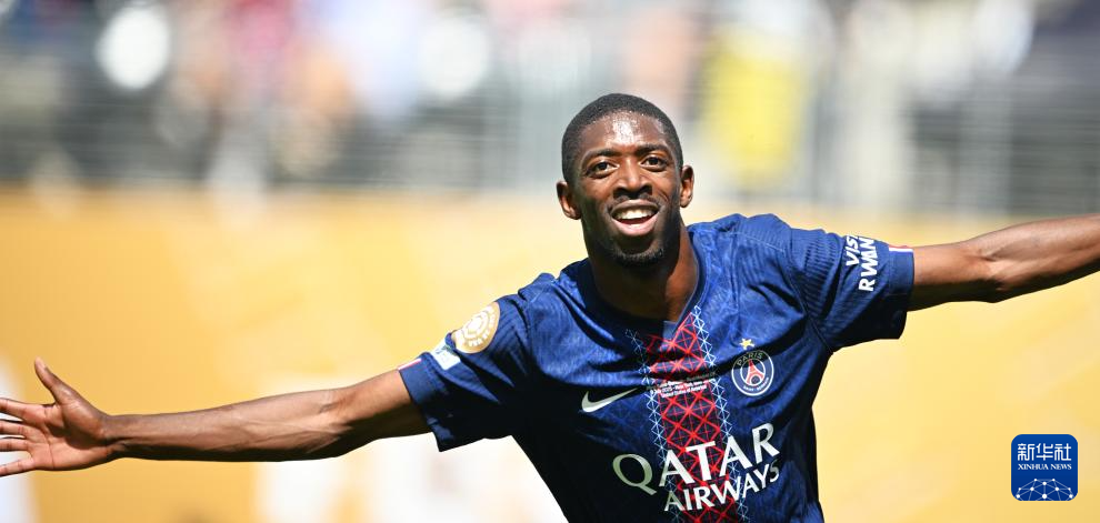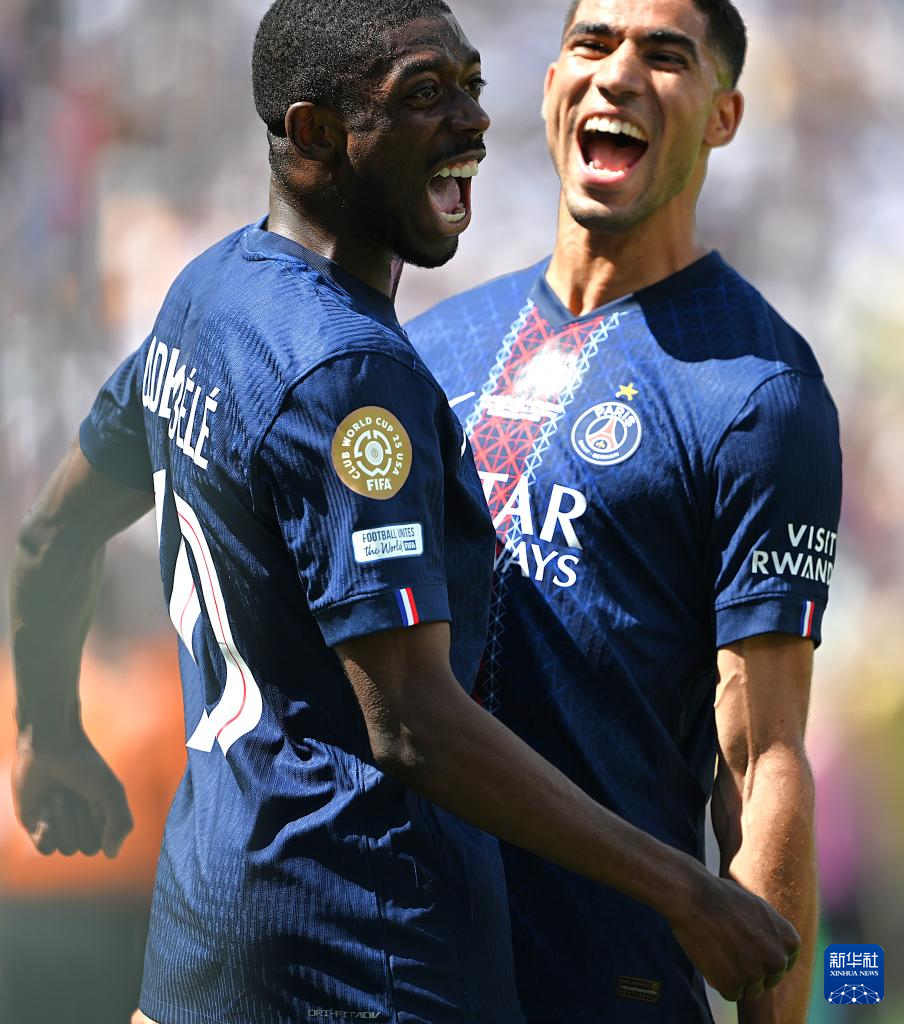 7月9日,巴黎圣日耳曼隊球員登貝萊(左)在比賽中破門得分后慶祝。新華社記者 吳曉凌 攝