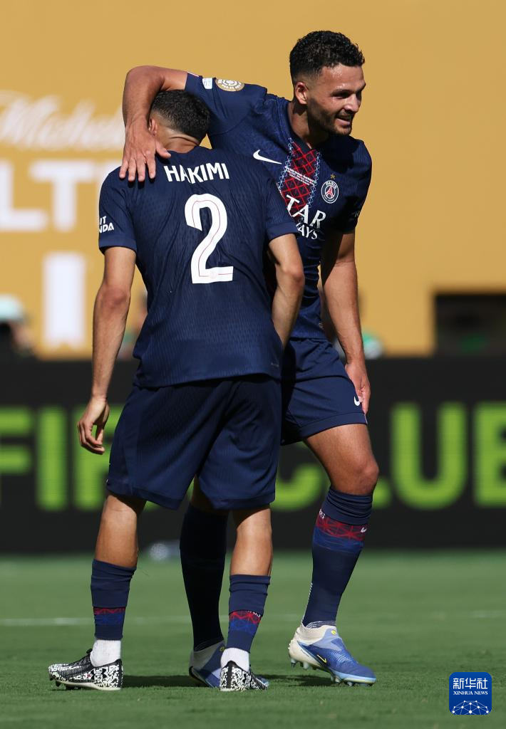 7月9日,巴黎圣日耳曼隊球員貢薩洛·拉莫斯(右)打入球隊第四粒進球后與隊友阿什拉夫·哈基米慶祝。新華社記者 李明 攝