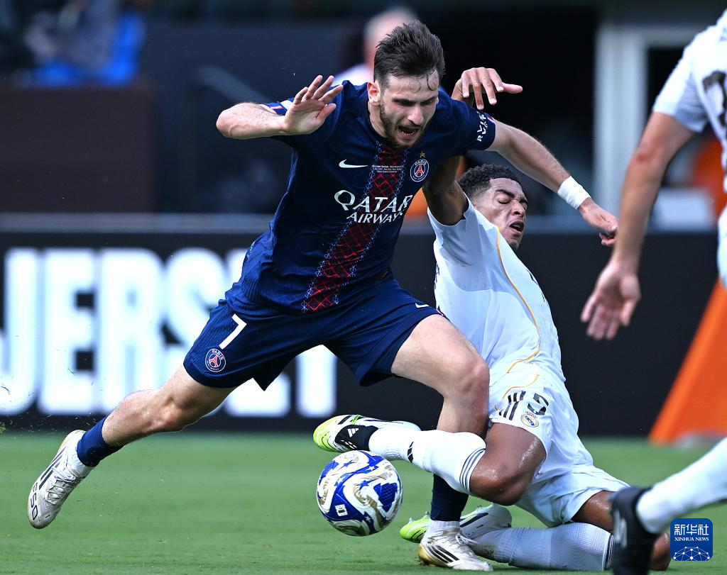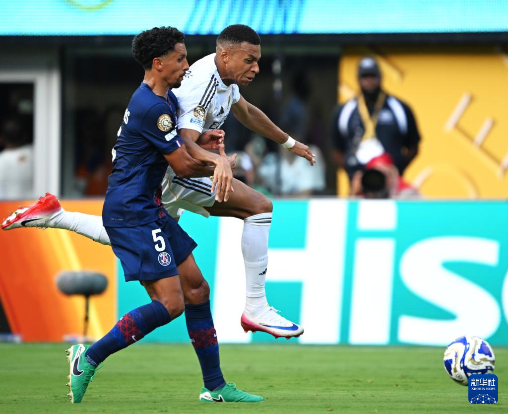 7月9日,皇馬隊球員姆巴佩(右)和巴黎圣日耳曼隊球員馬爾基尼奧斯在比賽中拼搶。新華社記者 吳曉凌 攝