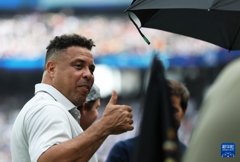7月9日,巴西足球名宿羅納爾多在賽前接受采訪時向觀眾致意。新華社記者 李明 攝
