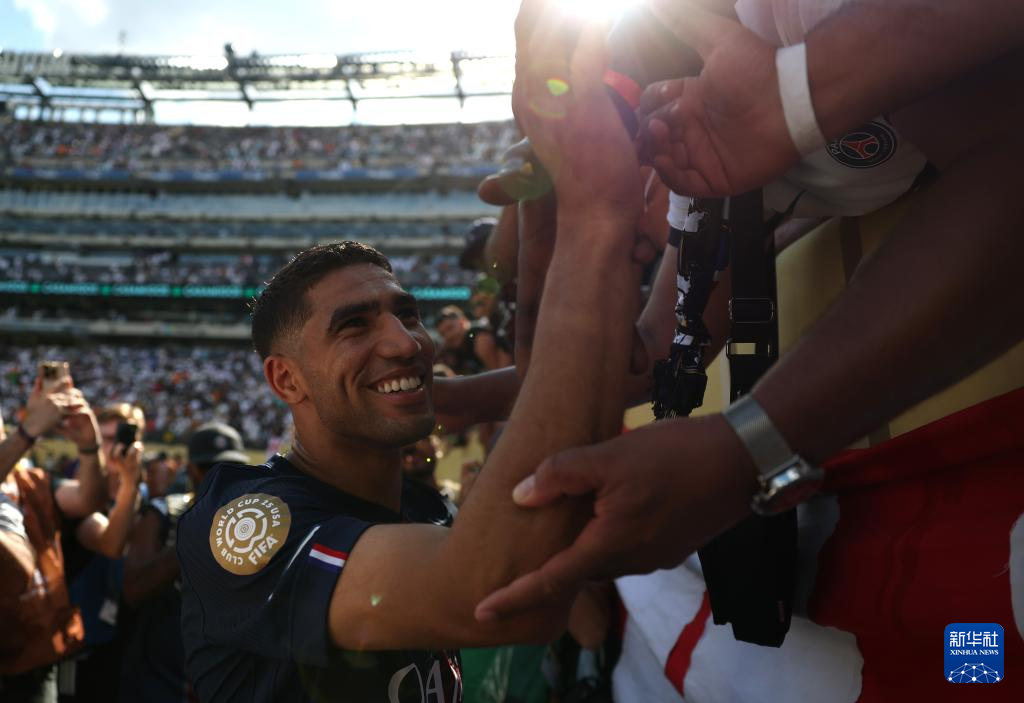 7月9日,巴黎圣日耳曼隊球員阿什拉夫·哈基米在比賽后與球迷互動。新華社記者 李明 攝