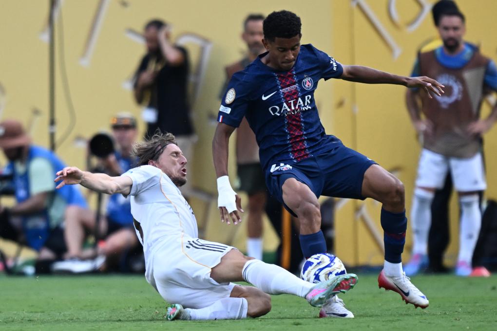 7月9日,皇馬球員莫德里奇(左)鏟斷巴黎圣日耳曼隊球員馬尤盧的球。新華社記者 李睿 攝