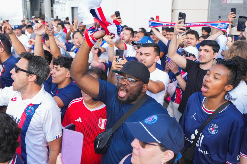 7月9日,世俱杯半決賽中,法國巴黎圣日耳曼隊4比0戰勝西班牙皇家馬德里隊,巴黎圣日耳曼隊球迷慶祝勝利。新華社記者 許暢 攝