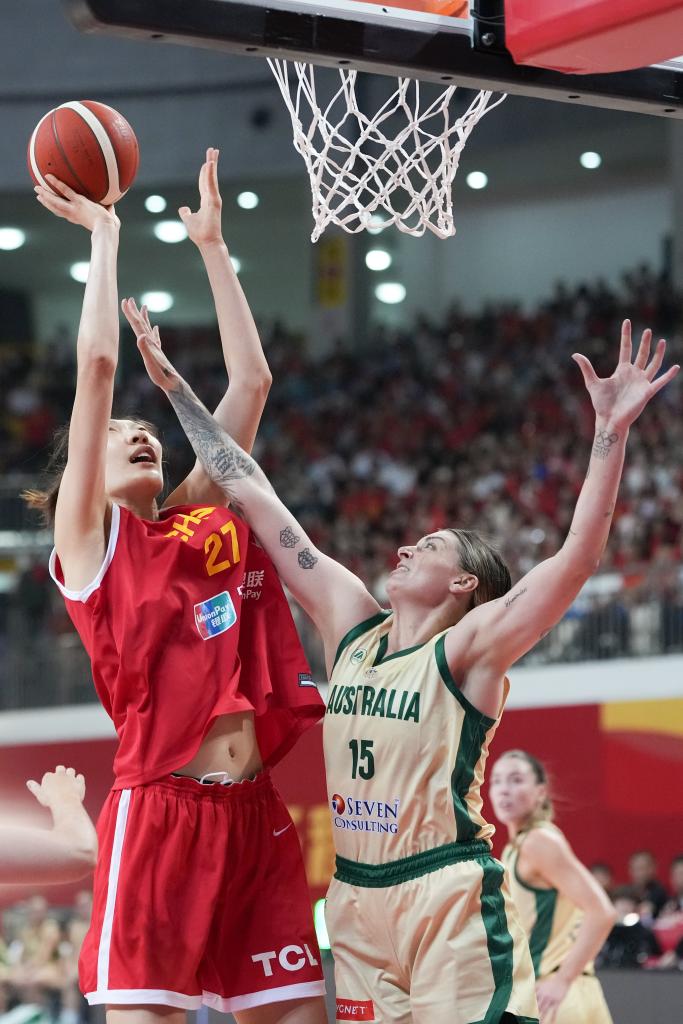 7月8日,中國隊球員楊舒予(前右)在中國隊與澳大利亞隊的熱身賽中上籃。新華社記者 薛宇舸 攝