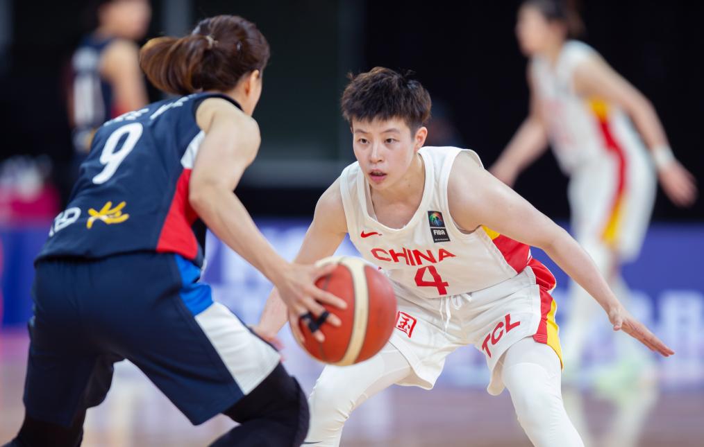 2023年6月28日,中國隊球員李緣(前右)在比賽中防守韓國隊球員李京恩。新華社發(胡涇辰攝)