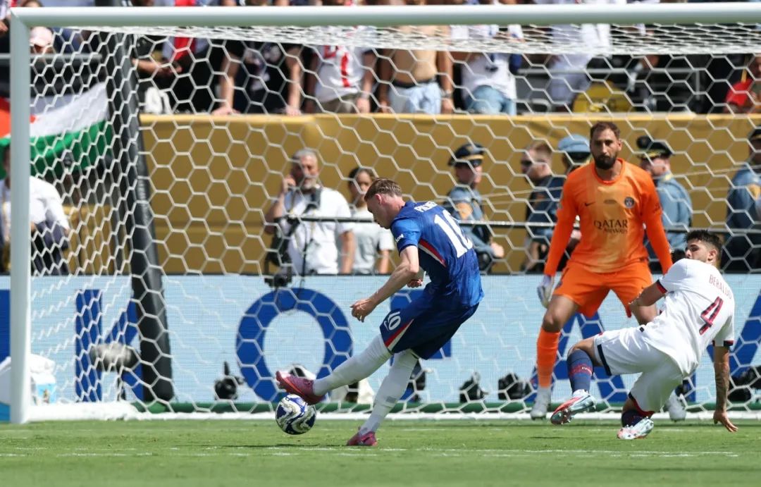 7月13日,切爾西隊球員帕爾默(左)在比賽中射門得分。新華社記者 李明 攝