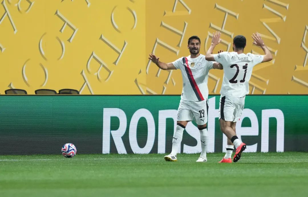 6月23日,曼城隊球員京多安(左)在進球后和隊友艾特-努里慶祝。新華社記者 許暢 攝